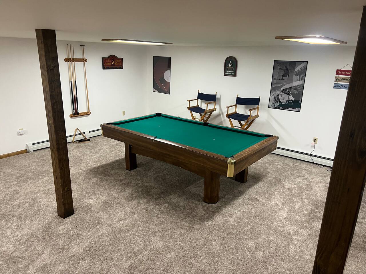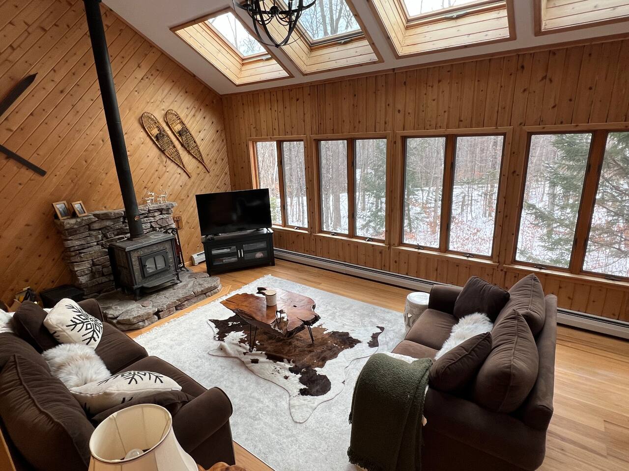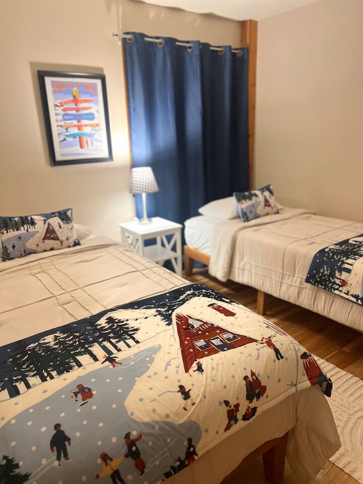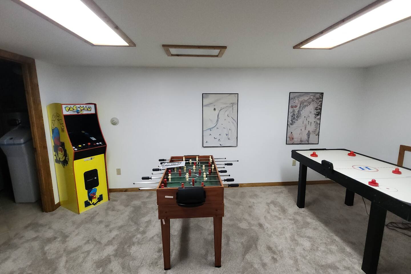 Sugarplum Lodge offers a warm, open layout designed for comfort during snowy Vermont winters. After a day on the slopes, relax by the wood-burning stove, unwind in the private hot tub under the stars, or challenge your group in the game room with arcade games. Thoughtfully designed for families and groups, this home blends rustic lodge charm with modern comfort — the perfect place to warm up and recharge after winter adventures. Main Living Area Beautiful living room with skylights and large windows to watch the snow fall while enjoying a VT soapstone wood burning stove. - Open-concept living room with indoor wood-burning stove - Comfortable seating for group gatherings - Smart TV and fast Wi-Fi Kitchen & Dining Recently renovated kitchen perfect to cook in with all the necessities. Bonus features of brand new kitchenware from Cuisinart, Titanium pans, and sharp knives. - Hot cocoa, coffee brewer, espresso machine, and tea bar (hot water kettle) - Fully stocked kitchen with dinnerware and cookware. - Dining table ideal for family dinners or après-ski meals - Available high chair, mini crib with pack and plays available. Bedrooms & Sleeping Easy sleeping with comfortable rooms, brand new mattresses, extra pillows, and extra sheets. - 3 private bedrooms - Flexible sleeping arrangements - Comfortably sleeps up to 9 guests - Extra blankets, towels, with soap and shampoo. Lower-level game room An epic game room fit for adults, teens, and kids with variety of entertainment for couples, groups, and families. - Classic arcade game (PacMan), Nintendo emulator - Foosball - Air hockey - Pool table - Dartboard - Board games and puzzles - Perfect for kids, teens, and snowy-day fun - Washer and dryer available for use (detergent on prem) Outdoor Winter Features - Private hot tub surrounded by trees - Large front and back yard with front patio and backyard deck. Adirondack chairs and rocking chairs for use - Fire pit and firewood available - Peaceful wooded setting with winter scenery - Mudroom includes indoor ski rack and boot and glove warmers to keep you warm before you head out to the slopes! Sauna (temporarily moved to garage due to weather) We have traveled extensively and have created all the best offerings from our experiences to bring to your vacation. Our home is next to the VAST trail and the road loops in to Okemo’s parking lot. We recommend AWD cars for driving on the mountain. Feel free to ask us any questions, we are here to bring you the quintessential Vermont experience! Perfect for ski weekends, holiday stays & winter getaways. Après-ski hot tub + game room = winter perfection!